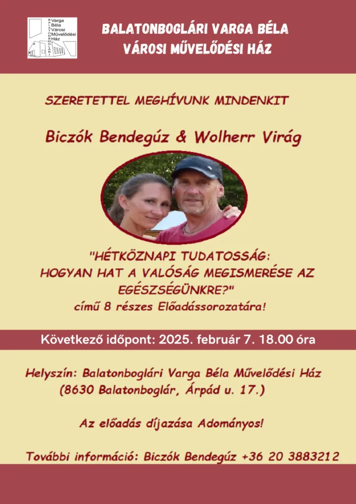Szeretettel várunk minden érdeklődőt Biczók Bendegúz és Wolherr Virág előadássorozatára, amely a hétköznapi tudatosság és a valóság megismerésének egészségünkre gyakorolt hatásait vizsgálja.