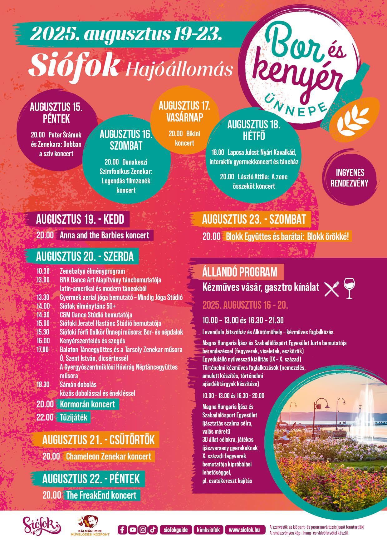 A Bor és Kenyér Ünnepe 2025-ben is vár mindenkit Siófok hajóállomásán augusztus 19–23. között.A rendezvény ideje alatt kézműves vásár, gasztronómiai kínálat, kulturális programok és