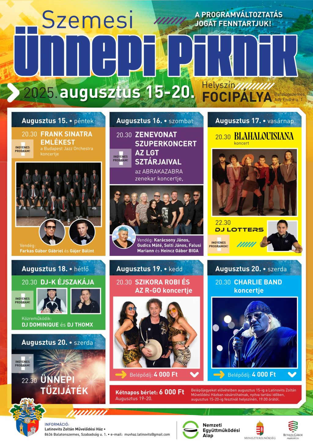 Csatlakozz hozzánk 2025. augusztus 15-20. között a festői Balatonszemesen a Focipályán. Ez egy egyedülálló lehetőség arra, hogy a nyár utolsó napjait élvezd kiváló zenei előadásokkal és változatos programokkal.